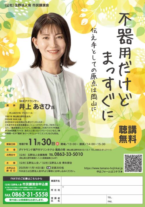 玉野市出身のNHKアナウンサー/井上あさひさんをお迎えして、ダイヤモンド瀬戸内マリンホテルで講演会「不器用だけどまっすぐに~伝え手としての原点は岡山に」を開催します。